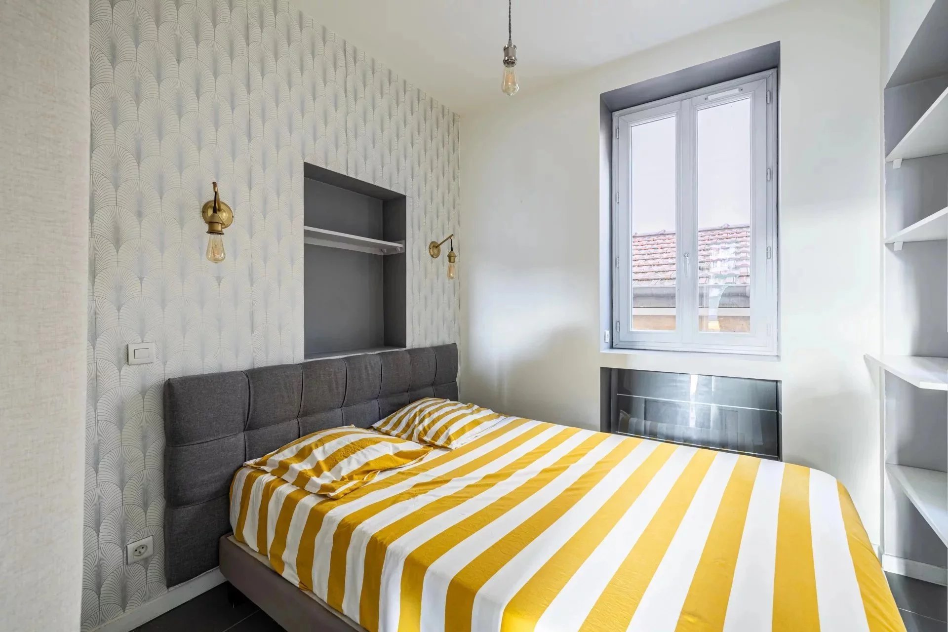 - Une chambre avec placard et rangements intégrés.